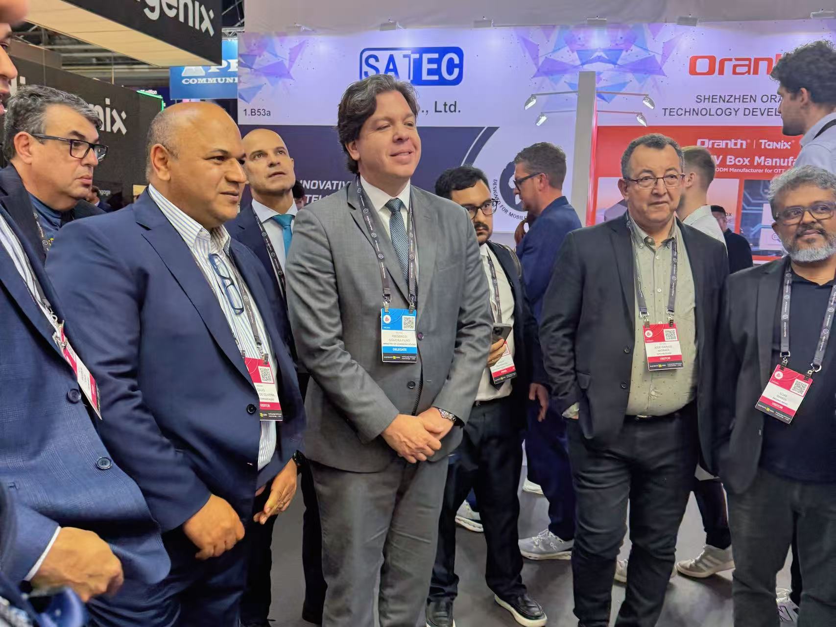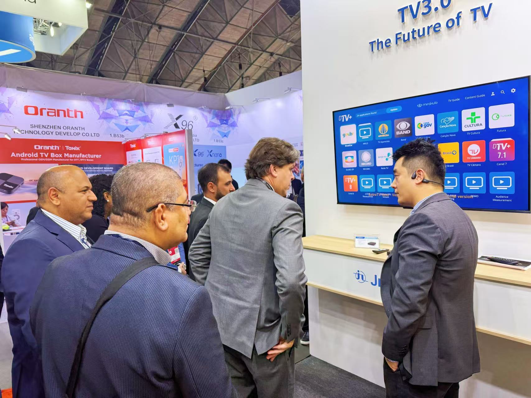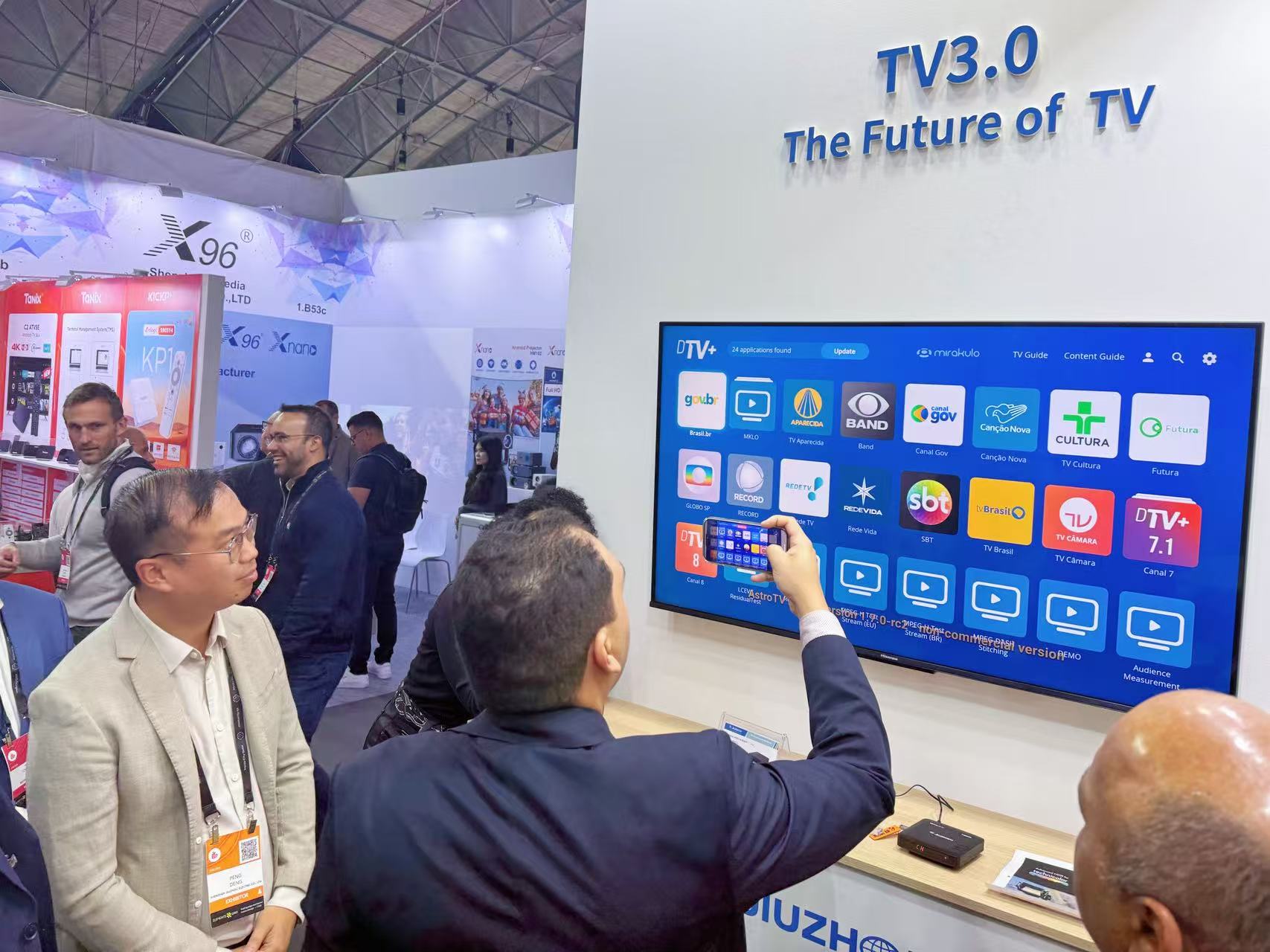 與此同時,最新研發的巴西下一代數字電視標準TV 3.0機頂盒引發高度關注 — 巴西通信部部長Frederico de Siqueira Filho駐足九洲展位,認真聆聽海外銷售團隊對該產品的講解。該產品憑借 “多標準兼容 + 超高清體驗 + 場景適配” 的核心優勢脫穎而出:一方面解決了不同區域信號接收的適配難題;另一方面搭載 Andriod 4K 系統,以超高清音畫技術精準還原細膩光影細節與立體聲音效,再結合多元內容池的資源支撐,可靈活滿足家庭集體觀影、個人碎片化追劇等多樣化需求,成為本次展會中體現 “技術適配性 + 用戶體驗感” 的代表性產品。