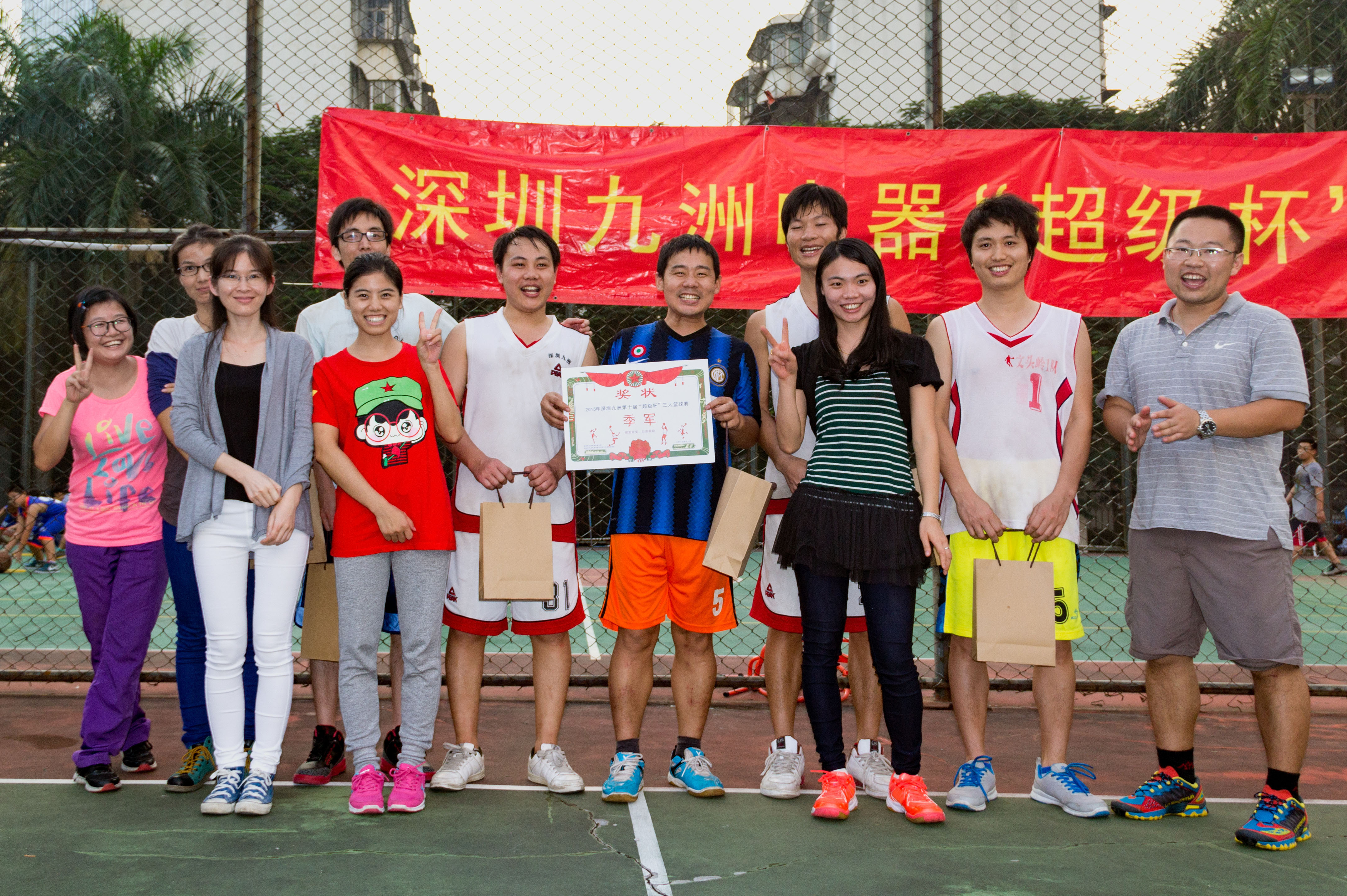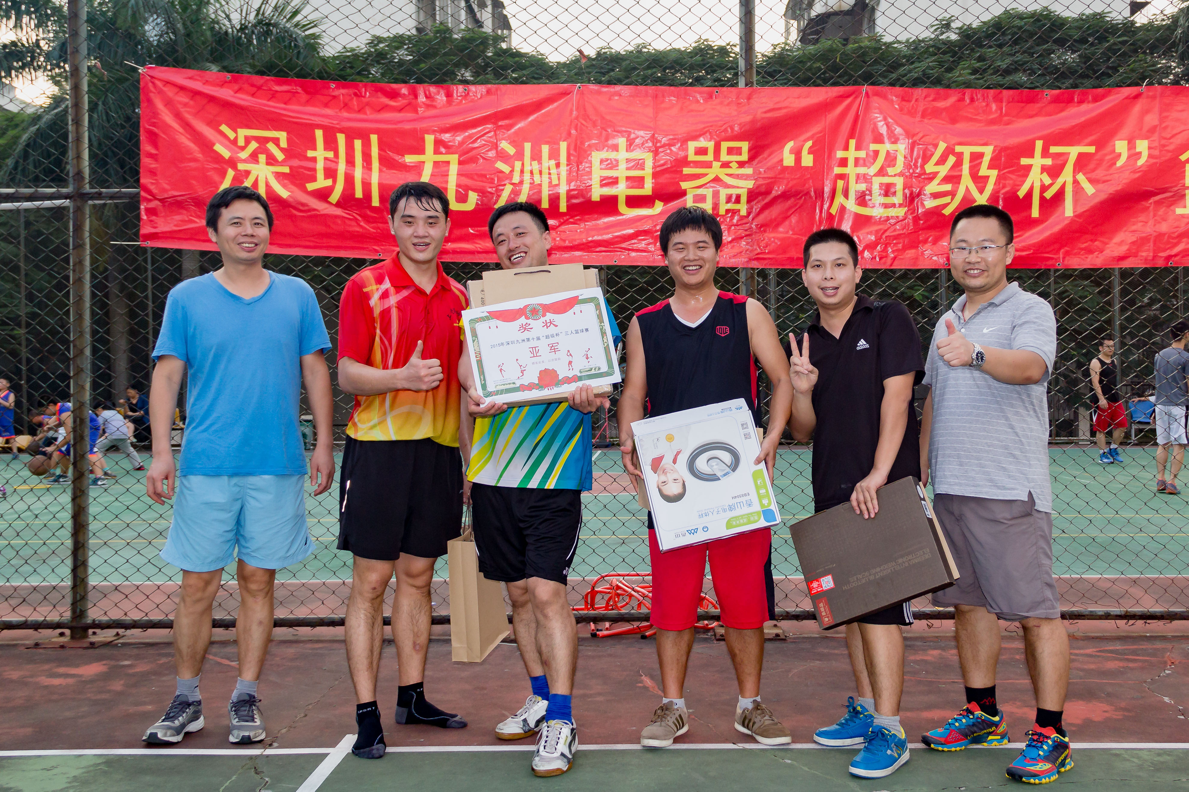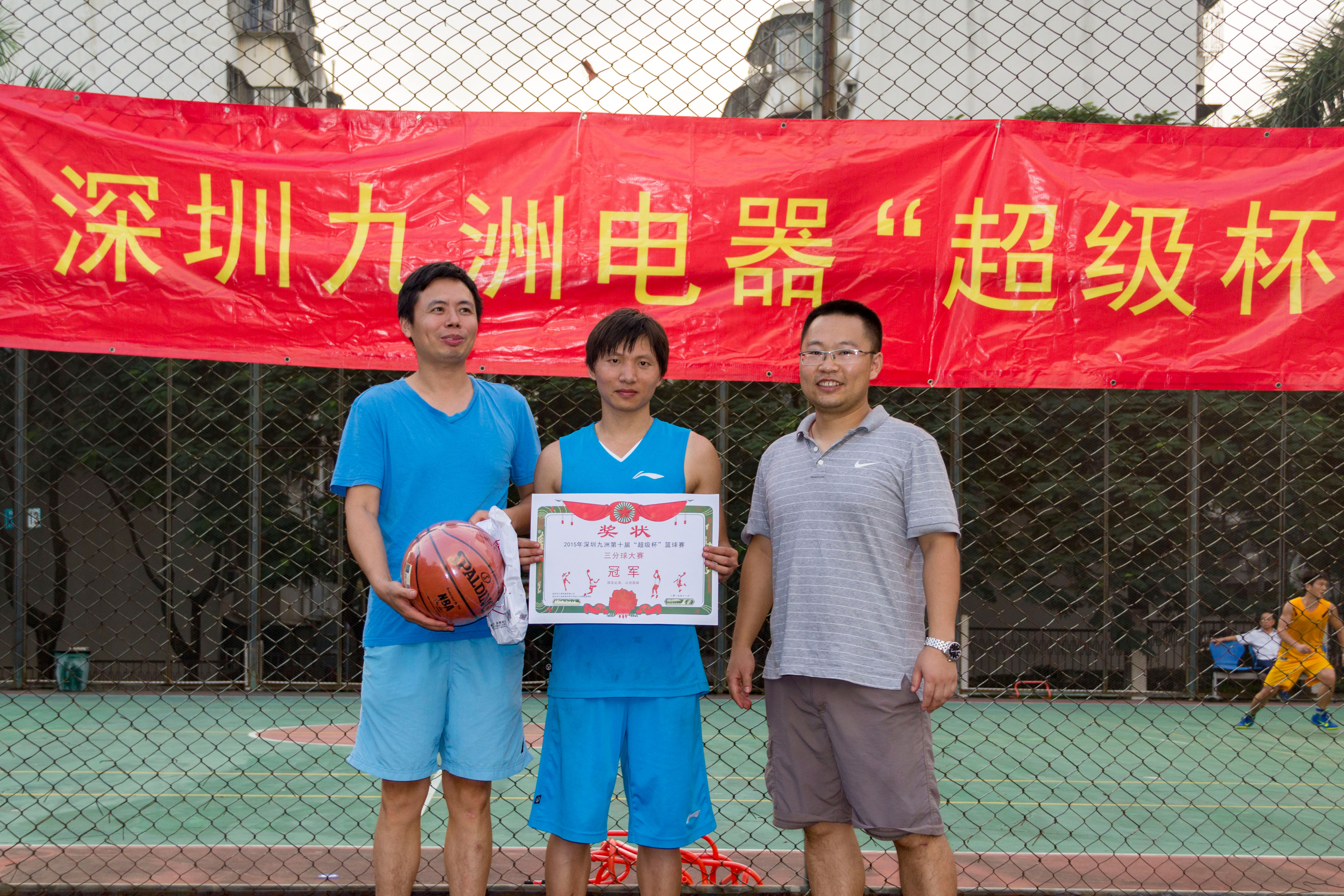 2015年11月14日,下午13時,深圳九洲第八屆“超級杯”籃球賽隨著一聲哨響正式拉開戰幕。 報名參加比賽有12支隊伍,分為4個小組進行比賽淘汰制,運動員們在場下是親密無間的同事,在球場上卻是你爭我趕,不放過任何一個得分的機會。歡呼聲、喝彩聲此起彼伏,經過3小時的艱苦鏖戰,籃筐終結者憑借良好的團隊配合和戰術運用,最終獲得冠軍;亞軍“技術支持部”、季軍“515又浪”、3分球冠軍程炳財,本屆籃球賽圓滿結束。