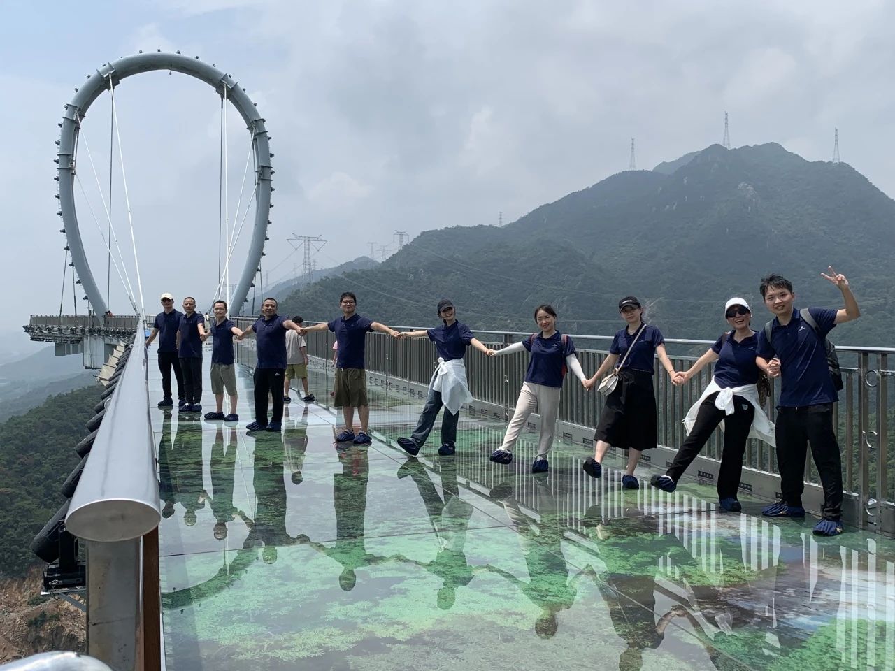 在藍天白云的映襯下,玻璃棧道宛如一顆璀璨的明珠鑲嵌在翠綠的山林之中;人事行政部的同事們毫不畏懼,攜手向前,繼續挑戰極限,走在玻璃棧道上,隨著每一步的前行,山谷與綠樹都在視野中展現得如詩如畫,仿佛置身于云端,讓大家感受到了大自然的壯麗恢弘與人類的智慧結晶。