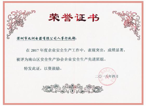 2018年4月20日南山區安全生產協會召開“深圳市南山區安全生產協會會員大會”,根據《關于評選2017年度企業安全生產先進班組、優秀管理人員的通知》的規定和要求,經專家評審小組評定,深圳市九洲電器有限公司人事行政部獲得“2017年度會員單位安全生產先進班組”的榮譽稱號。