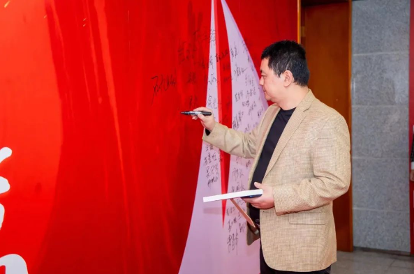深九同仁們在主背景板處拍照打卡,留下幸福瞬間,并陸續在印有帆船形狀,寓意揚帆起航的簽到板上簽名,代表著九洲人在新的一年攜手并進,乘風破浪!
