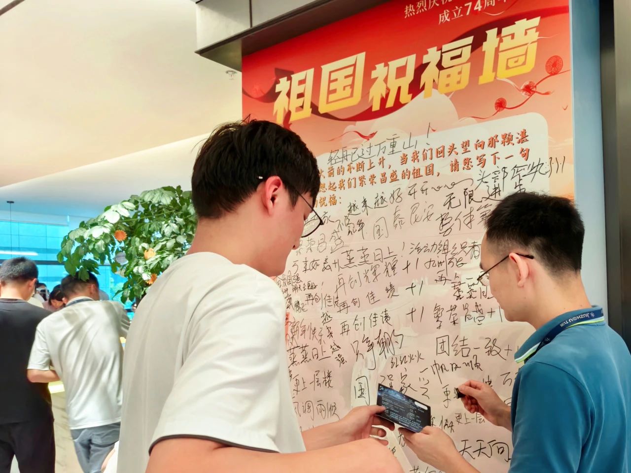 同事們?cè)谧鎳?guó)祝福墻提筆寫下對(duì)祖國(guó)的美好祝愿或?qū)ι畹拿篮迷妇啊R痪渚鋭?dòng)人的祝福語(yǔ),抒發(fā)了大家真摯的愛(ài)國(guó)之情。